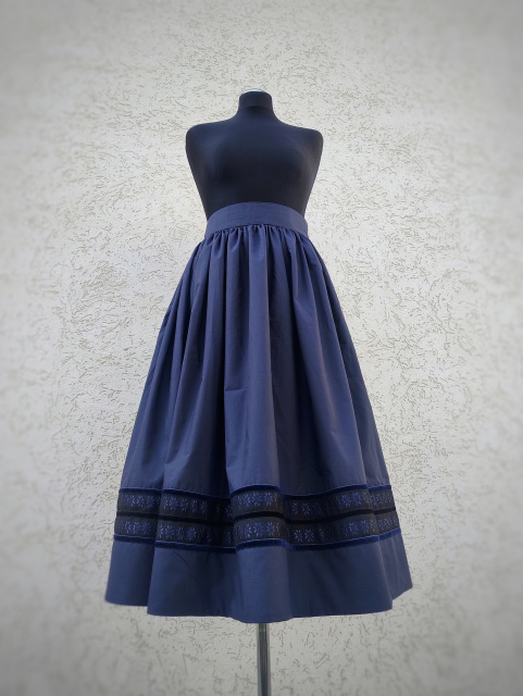 Бавовняна спідничка графітового кольору з темно-синім підтоном. Пишно зібрана в талії. Підшита по подолу жакардом, прикрашена оксамитовими та жаккардовими стрічками.